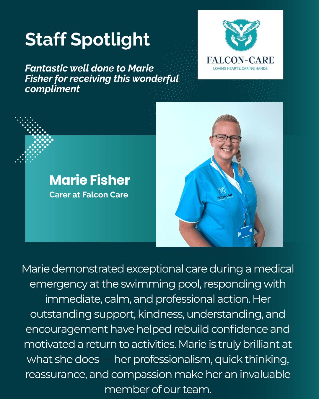 Falcon-Care made me feel at ease when choosing the right care for my Mum, We could not have wished for better care or better service.